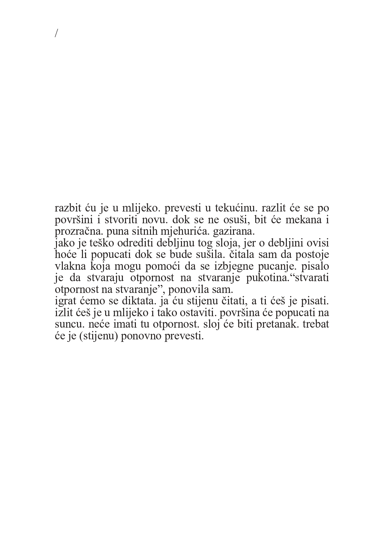 Following her earlier investigations into human impact on the natural environment and the constraints of natural givens such as the physical properties of materials and manifest forms of matter, Lucija Ostrogović in her work I’ll break her gently curated by Lucija Furač enters an interior space organized around a massive, irregular rock hidden behind a door and a curtain. The owner of this dwelling, whose everyday life the viewer loosely follows, lives in constant adaptation to the rock, devising fascinating ways to at least partially restrain and tame it, and even to harness the potential of its form for simple, everyday needs.