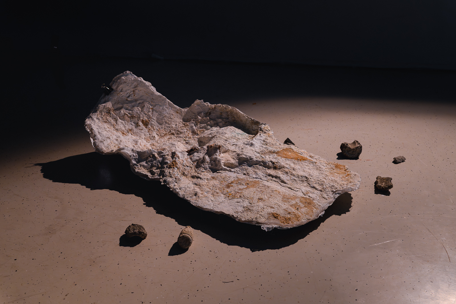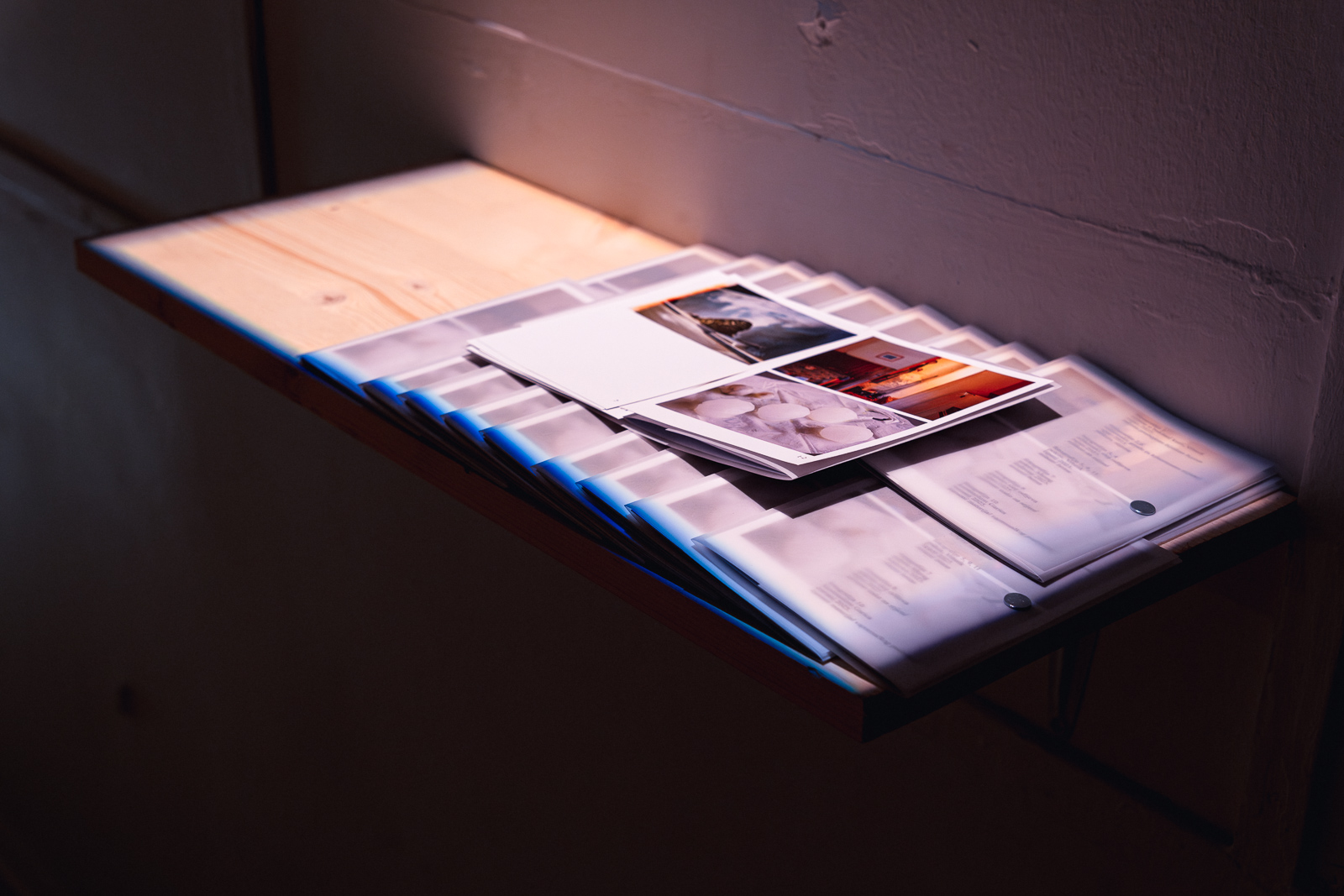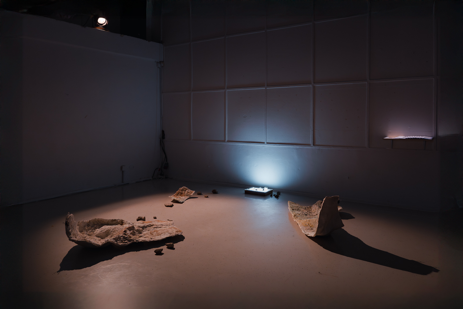 Interweaving photographs and text, the work reconstructs these spatial relations in the gallery context—partly literally, and partly in the mind of the viewer. Continually seeking a narrative thread, the viewer also immerses herself in relations between soft and hard, smooth and rough, liquid and solid, cold and warm, and wet and dry. Training the gaze anthropomorphizes the rock, which is initially read as merely a bizarre impediment to the organization of domestic space. This play with ways of seeing and understanding things, where the position of people in relation to given natural elements matters, rests as much on observing with the eye as on a particular narrative perspective and linguistic choices.